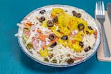 Cold noodles, tomatoes, olives, onions, green peppers, peperoncini, artichokes, and mozzarella cheese.