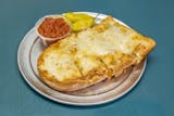 Warmed french bread with a thin layer of garlic butter served with a side of marinara sauce, and pepperoncini.